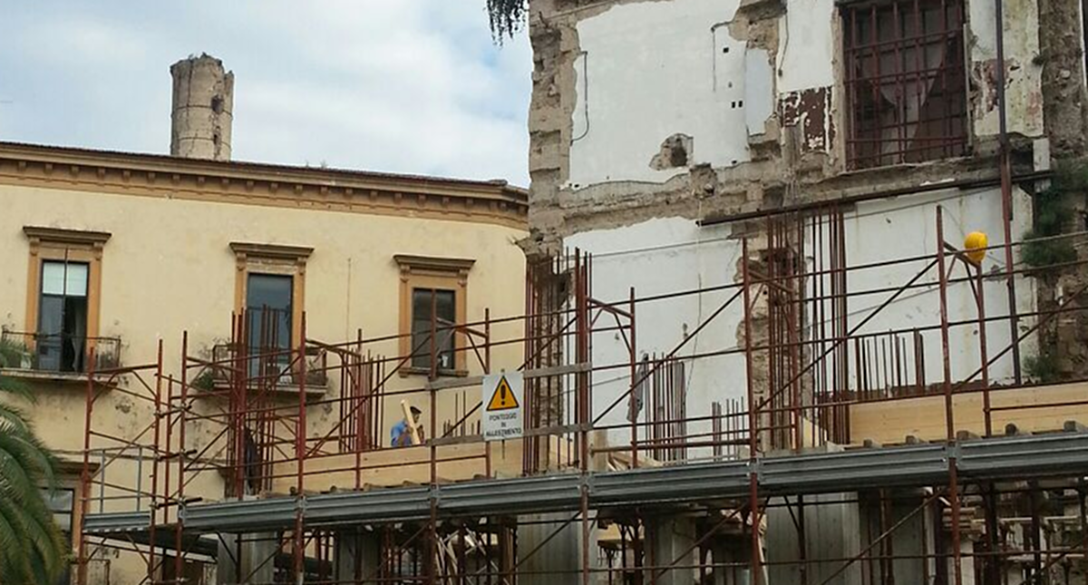 Una struttura incompleta in cemento armato che dovrebbe costituire l’ossatura di una discutibile costruzione concepita in ampliamento alla porzione vincolata del vecchio Municipio, già antico Sedile dell’Università di Maddaloni dove, tra l’altro, è custodito lo stemma della città scolpito nel 1546; ad aggravare la situazione, i resti del colpevole crollo del dicembre 2011 di cui, almeno al momento, pare non siano stati individuati i responsabili.
