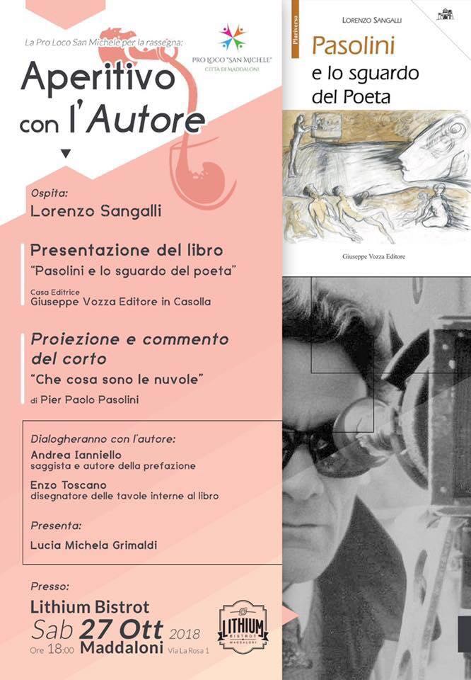 MADDALONI – La Pro Loco “San Michele”, nell’ambito della rassegna “Aperitivo con l’Autore”, presenta, sabato 27 ottobre 2018, con inizio alle ore 18.00 presso il “Lithium Bistrot” l’ultimo lavoro di Lorenzo Sangalli. Si tratta del libro “Pasolini e lo sguardo del Poeta”, che, edito nel 2017 da Giuseppe Vozza editore (Caserta), traduce in scrittura organica il parlato sciolto di una serie di conferenze tenute dall’autore a partire dal 2013 sul tema del cinema di Pasolini, con particolare riferimento al celebre cortometraggio che fu parte del film a episodi Capriccio all’italiana. Dialogheranno con l’Autore: Andrea Ianniello, saggista ed autore della prefazione, e Enzo Toscano, autore delle tavole interne al libro. Infatti, lo studio, impreziosito dai disegni di Enzo Toscano, si avvale di una prefazione firmata da Andrea A. Ianniello, esperto di cinema, non solo pasoliniano. A suo parere, lo studio offre interessanti spunti di riflessione, incardinati in particolare intorno a due aspetti: la valorizzazione della sensibilità “spirituale” di Pasolini, e dell’apparato di simboli iconici che ne restituiscono la tensione, e la denuncia radicale della degradazione innescata dalla civiltà del neocapitalismo mercificante. Di quella implacabile requisitoria pasoliniana Ianniello sostiene che resiste non tanto il contenuto polemico, quanto l’intensità e la sostanza della critica, in particolare nei confronti di quel “Potere senza volto”, trasformista e camaleontico, che oggi, nelle mutate condizioni socio-economiche del post-consumismo, continua a mantenere saldo il controllo della società e dell’umanità occidentali.