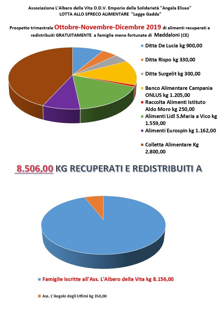L’associazione L’Albero della Vita O.D.V. – Emporio della Solidarietà “Angela Eliseo” Maddaloni (Ce)comunica i dati relativi all’ultimo TRIMESTRE “OTTOBRE-NOVEMBRE-DICEMBRE” dell’Emporio della Solidarietà “Angela Eliseo” 3R (Recupero, Riciclo e Redistribuzione) e quindi i dati dell’intero anno 2019. – Ci teniamo a precisare che L’Ass. L’Albero della Vita è iscritta al Registro Regionale della Associazioni di Volontariato con decreto n.212 del 17/03/2016 e pertanto tutto il nostro operato viene rendicontato e depositato presso gli organi competenti- afferma il presidente Suppa . Inoltre l’associazione vuole anche ringraziare quanti collaborano con l’attività che svolge quotidianamente sul territorio: Banco Alimentare della Campania, LIDL di Santa Maria A Vico, Eurospin di Maddaloni, la Ditta De Lucia, la Ditta Rispo, il Pastificio Reggia, la Ditta Badia, la Ditta Surgelit, Vaganova Center Ballet, la A.G.SERVICE S.P.A., il negozio il Buongusto in Tavola , la compagnia “Il Borgo 2.0”,gli studenti degli istituti del Liceo Classico Giordano Bruno , del Liceo Statale “Don Gnocchi” ’ e della Fondazione Villaggio dei Ragazzi – Don Salvatore d’Angelo con i rispettivi Dirigenti, i TANTI Privati che, anche con il loro contributo economico, hanno creduto in questo progetto ed hanno reso possibile arrivare a queste cifre. Un Grazie speciale va al Sig. Del Monaco Salvatore, marito della compianta Angela Eliseo a cui è dedicato L’Emporio della Solidarietà, per il suo sostegno e al Sig. Capocelli Mario per aver ristrutturato gratuitamente la sede dell’Emporio della Solidarietà.