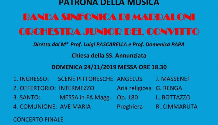 Maddaloni, questa sera ,  domenica 24 novembre 2019, concerto di Santa Cecilia alla chiesa della SS. Annunziata con la Banda Sinfonica della Città