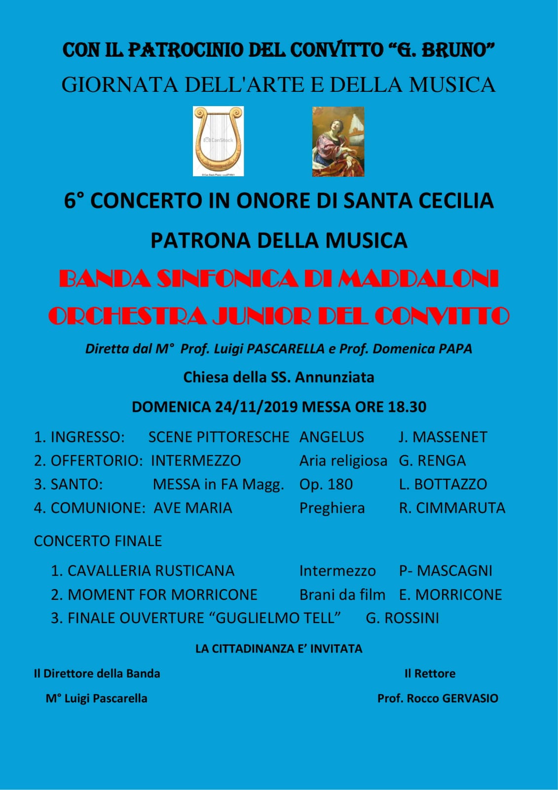 L’appuntamento è realizzato in pieno coinvolgimento con il Convitto Nazionale Statale “Giordano Bruno” di Maddaloni che patrocina il Concerto in onore della patrona della Musica, non l’unico in verità nella città delle due torri, ma il più atteso e che si concretizzerà tra poche ore domenica 24 novembre 2019.