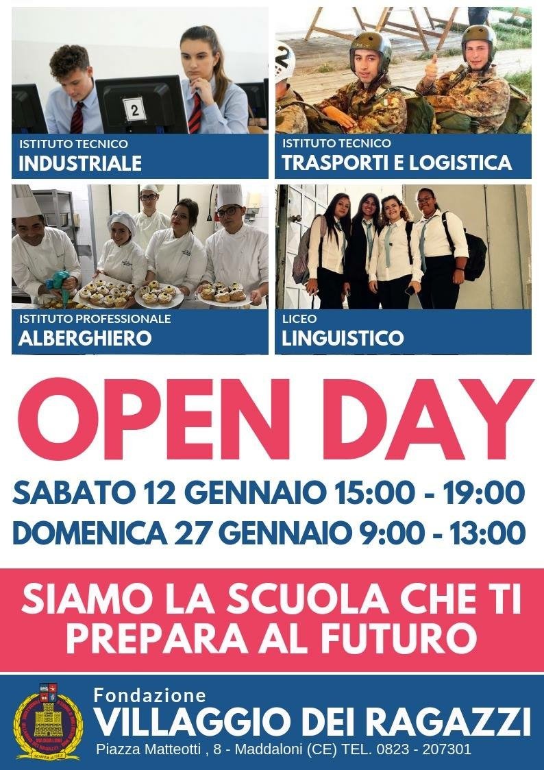Maddaloni . Anche quest’anno, in occasione degli Open Days, gli Istituti della Fondazione Villaggio dei Ragazzi (Istituto Tecnico, Istituto Tecnico Traporti e Logistica, Istituto Alberghiero, Liceo Linguistico), guidati dai Coordinatori Scolastici, Giovanna D’Onofrio e Claudio Petrone, aprono le loro porte ai giovani provenienti dalle Scuole Medie del territorio.