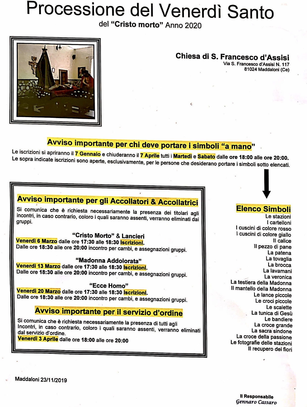 Non abbiamo sbagliato titolo nell’articolo. E’ vero che tutti si preparano in questo periodo alle festività natalizie, ma l’organizzazione della tradizionale processione del Venerdì Santo guarda già oltre. La Tradizionale processione maddalonese di cui scriviamo è unica nel suo genere e complessa per organizzazione e per il numero di presenze e i ruoli dei partecipanti. Per cui, quest’anno il responsabile Gennaro Cassaro ha stabilito che, concluse le festività natalizie, inizierà subito le iscrizioni. Tutto è calendarizzato nella locandina di seguito allegata. Già dal 7 gennaio fino al 7 aprile, tutti i martedì e sabato dalle 18.00 alle 20.00 ci si potrà iscrivere per i portatori di simboli. Per gli accollatori delle statue le date da fissare saranno i venerdì di marzo giorni 06-13 e 20 rispettivamente per Cristo morto e lancieri, Madonna Addolorata ed Ecce homo. La riunione per il servizio d’ordine invece è stata programmata per venerdì 3 aprile. Precisione, efficienza ed una programmazione dettagliata: questo ci ha tenuto ha sottolineare il responsabile dell’evento religioso. Tutti gli appuntamenti sono presso la chiesa di via San Francesco d’Assisi.
