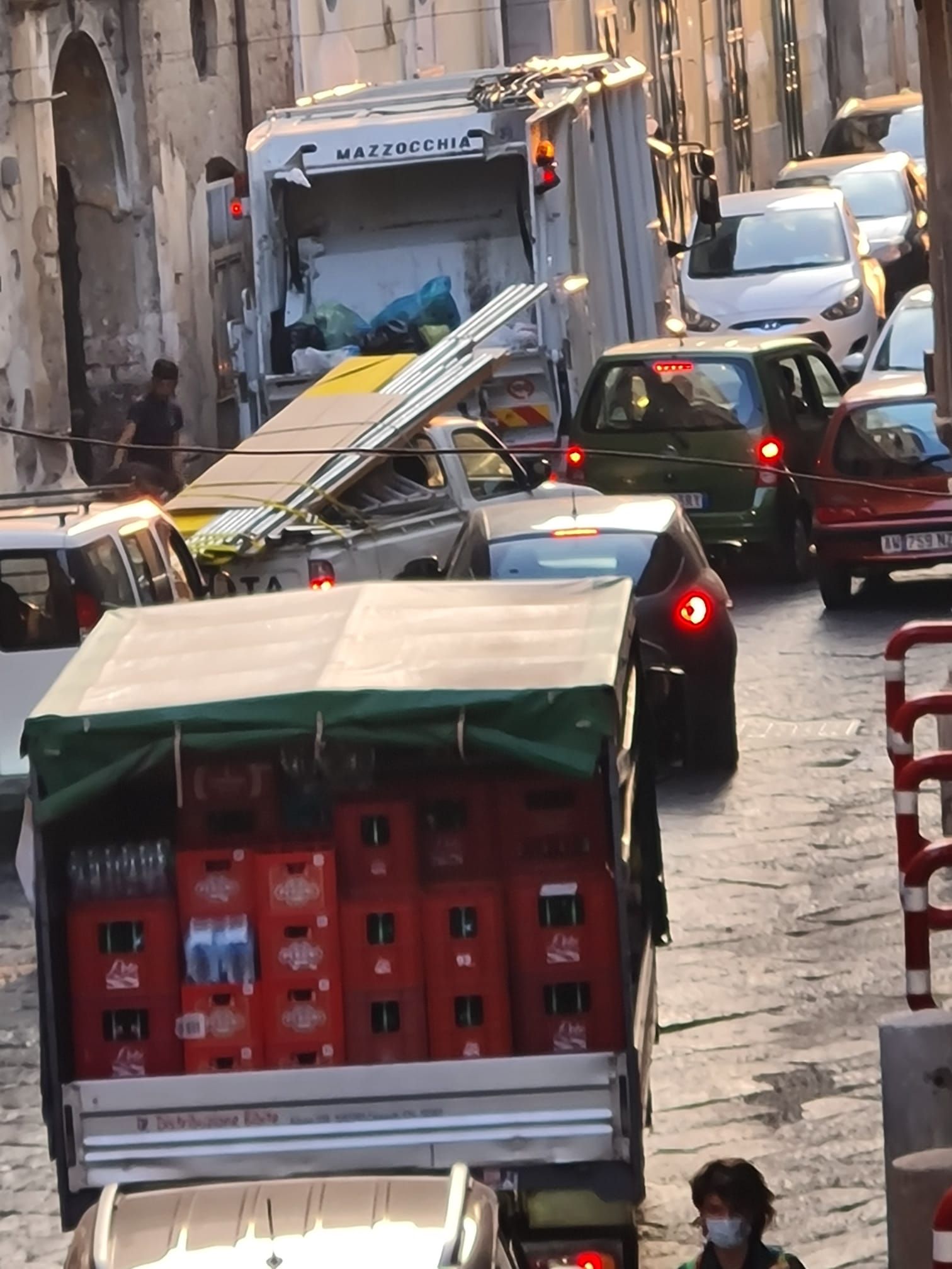 Via Ponte Carolino, specie di mattina, anche con il camion della nettezza urbana che spesso passa in concomitanza dell’apertura di scuole, uffici ed attività commerciali: