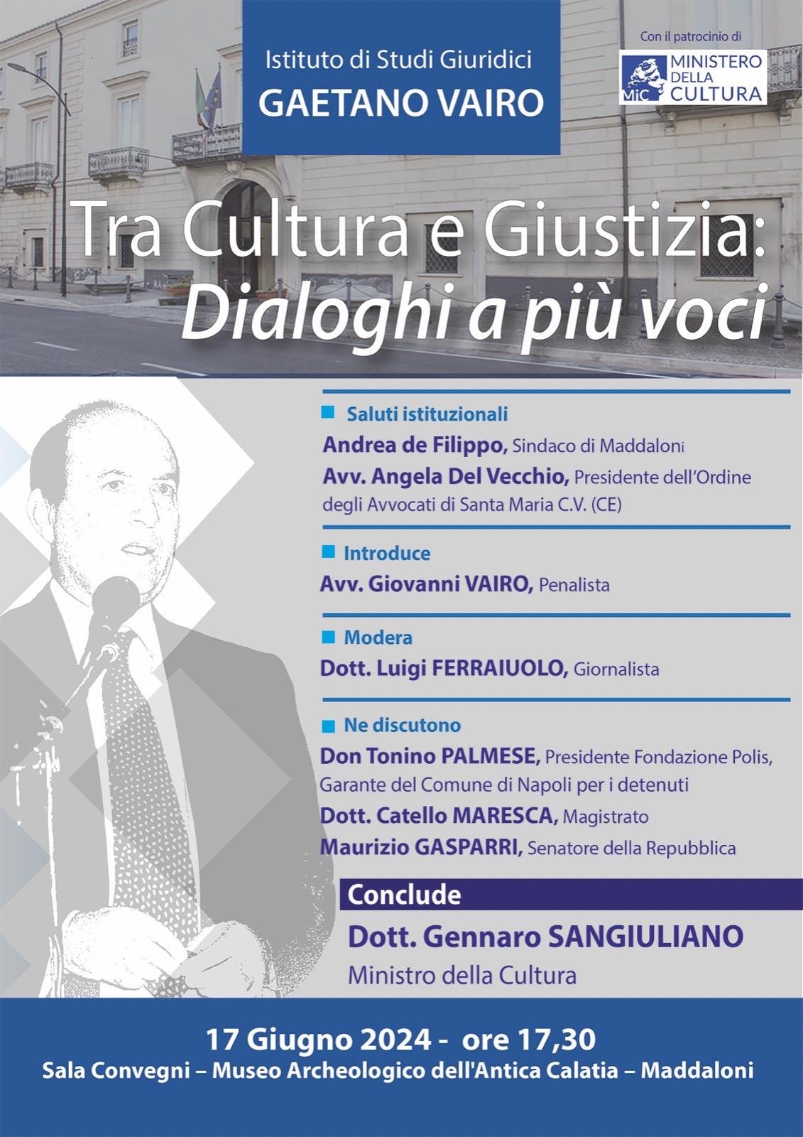 MADDALONI- Per improrogabili impegni del ministro della cultura Gennaro Sangiuliano, il convegno “Tra cultura e giustizia: dialogo a più voci” è stato rinviato a data da destinarsi. La manifestazione doveva tenersi oggi pomeriggio, lunedì 17 giugno, alle 17.30. Gli organizzatori dell’ “Istituto di Studi Giuridici Gaetano Vairo”, compatibilmente con la folta agenda istituzionale, comunicheranno la nuova data del confronto studi che si terrà sempre, come da da consolidata tradizione, presso il Museo Archeologico Calatia. Confermano altresì la piena disponibilità di don Tonino Palmese (presidente della Fondazione Polis e garante dei detenuti del comune di Napoli), del magistrato Catello Maresca e del senatore Maurizio Gasparri.