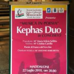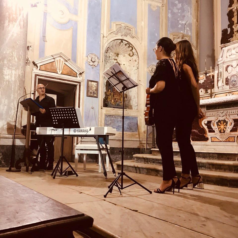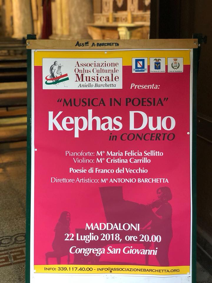 MADDALONI – Grazie all’organizzazione dell’Associazione Culturale Musicale ONLUS “Aniello Barchetta”, domenica 22 luglio a Maddaloni si è svolto un evento, presso la Congrega di San Giovanni Battista di Maddaloni, con “Kephas Duo”, al piano forte il Maestro Maria Felicia Sellitto e al violino il Maestro Cristina Carrillo, e il poeta Franco Del Vecchio, sotto la direzione artistica del Maestro Antonio Barchetta, fondatore e presidente dell’Associazione Culturale Musicale ONLUS “Aniello Barchetta”. La serata ha goduto dei patrocini morali della Regione Campania, della Provincia di Caserta e del Comune di Maddaloni.