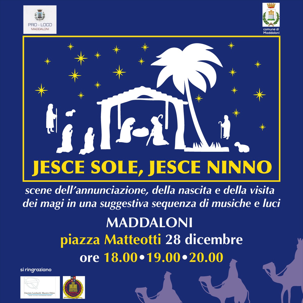 Il giorno seguente, sabato 28 dicembre alle ore 18, in Piazza Matteotti ci sarà la rappresentazione di un presepe vivente in costume molto suggestivo: uno spettacolo di musiche e luci dal titolo “Jesce sole jesce ninno”. Questo evento è patrocinato dal comune di Maddaloni. Un’atmosfera magica sarà ricreata nella piazza per questa rappresentazione che è una novità per la città.
