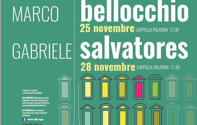 Per coloro che volessero prenderne parte c’ è la possiblità di prenotarsi , gli accrediti possono essere fatti , a partire dal 20 novembre per l’evento con Marco Bellocchio e dal 22 novembre per quello con Gabriele Salvatores, sulla pagina Facebook dell’evento maestri alla reggia.