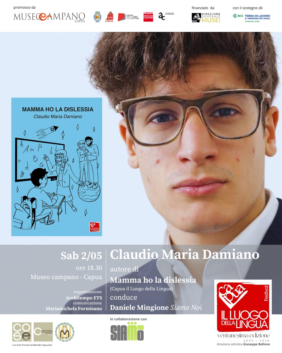 Sabato 2 maggio 2026, alle 18,30 al Museo Campano, sarà presentato il libro di Claudio Damiano, “Mamma, ho la dislessia”, il primo libro edito da Capua il Luogo della Lingua festival. Qualche tempo fa Claudio, un ragazzo di 19 anni, ci ha contattato per raccontarci il suo progetto: un fumetto autobiografico capace di dare voce, con autenticità e coraggio, alla sua esperienza. Abbiamo scelto di accompagnarlo in questo percorso e di aiutarlo a pubblicarlo, diventando anche editori del suo libro. Durante l’incontro, insieme a Daniele Mingione e al collettivo giovanile Siamo Noi, Claudio condividerà la sua storia. Sarà anche il momento in cui presenteremo il programma della ventunesima edizione di Capua Il Luogo della Lingua Festival, che aprirà ufficialmente il Maggio dei libri. Un appuntamento che unisce storie, percorsi e visioni. E che, ancora una volta, mette al centro loro: i giovani. Non il futuro del festival. Ma già il suo presente.