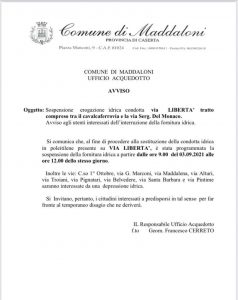 Comunicato Stampa Il Comune di Maddaloni informa che domani 3 Settembre dalle ore 09.00 alle 12.00 dello stesso giorno sarà sospesa l’erogazione idrica in via libertà nel tratto stradale tra il cavalcaferrovia e via Sergente Del Monaco per ragioni tecniche e di lavori di sostituzione della condotta. Inoltre le seguenti strade saranno interessate da una depressione idrica: Corso I Ottobre, via Maddalena, via Troiani, via Alturi, via Pignatari, via Belvedere, via Santa Barbara , via Pintime. Si invitano i cittadini interessati a predisporsi in tal senso per far fronte al temporaneo disagio che ne deriverà.