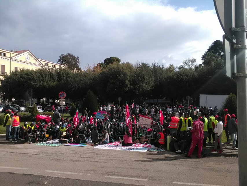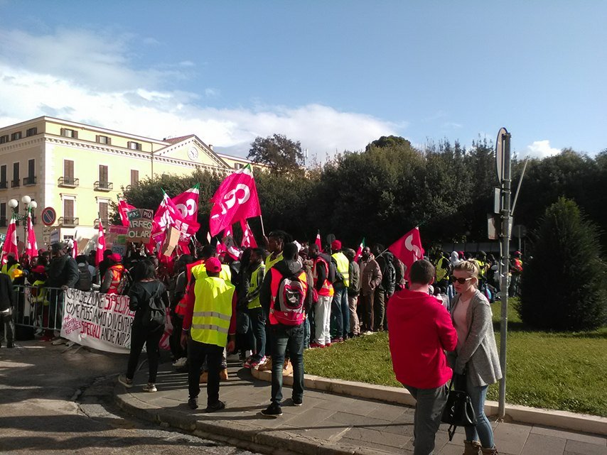 Caserta – manifestazione di protesta oggi fuori la sede della Prefettura e della Questura a Piazza Vanvitelli,  a protestare, pacificamente, nonostante uno spiegamento di forze dell’ordine, sono gli iscritti della CGIL di Caserta, alle prese con la mancata concessione e problemi di rinnovo del permesso di soggiorno.
