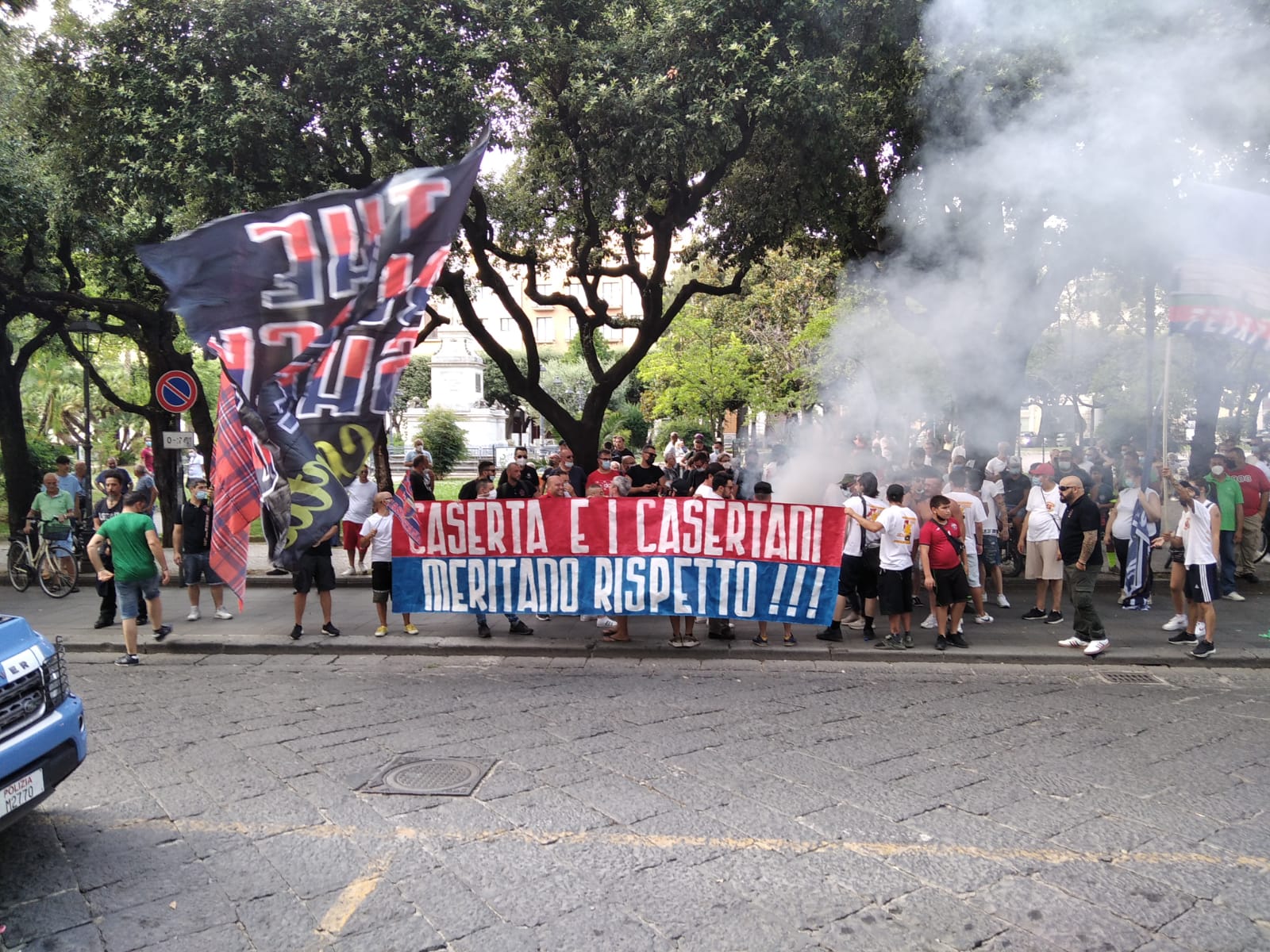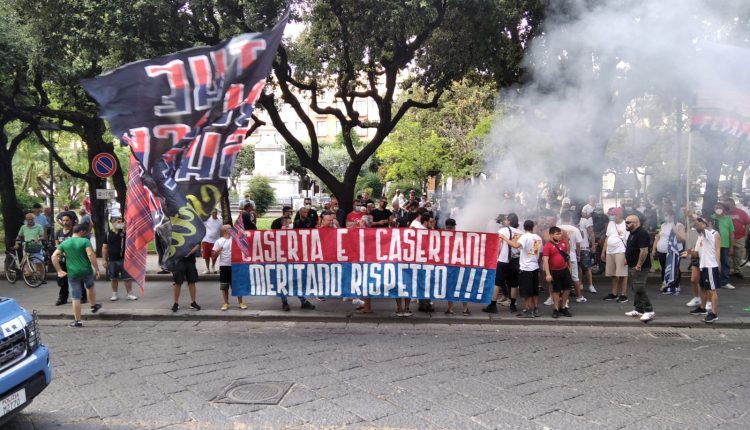 Caserta. In questo momento e’ in corso la manifestazione che i tifosi della Casertana hanno organizzato in Piazza Vanvitelli in seguito dall’ esclusione della squadra dalla lega pro.