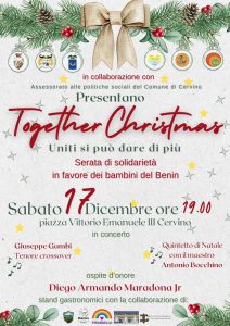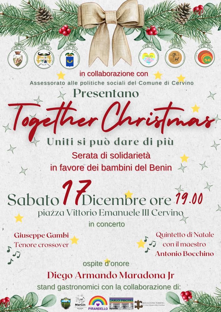 Tutto pronto per Christmas together, l’evento che vede Uniti nel segno della solidarietà le associazioni Cermes for, Solidarietà cervinese e Donare è amore in collaborazione con L’assessorato alle politiche sociali del Comune di Cervino, che si terrà sabato 17 dicembre alle ore 19:00 in piazza Vittorio Emanuele III di Cervino, in una serata che si prospetta ricca di emozioni, tanti ospiti, nonché autorità e big tra cui Maradona junior.