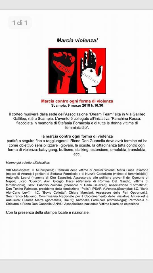 “Aderiamo con convinzione alla Marcia contro ogni forma di violenza che si terrà a Scampia venerdì 9 marzo alle 16.30 perché è giusto sostenere questa iniziativa che ha già ottenuto l’adesione di Istituzioni e associazioni, tutte unite per continuare a sensibilizzare contro la violenza in tutte le sue forme”.