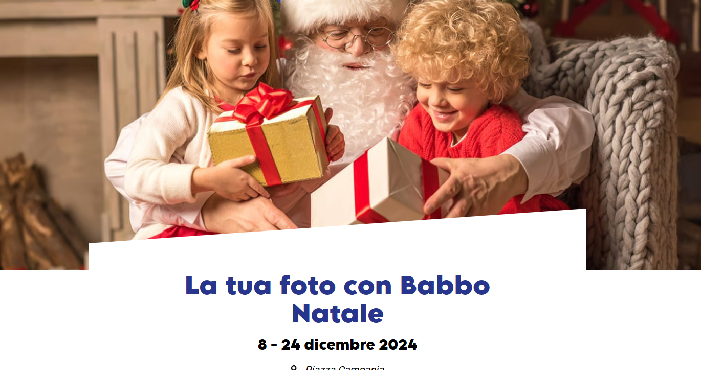 Dal giorno dell’Immacolata 8 dicembre fino alla vigilia di Natale, Babbo Natale sarà presente al centro commerciale campania. Babbo Natale contornato dalle luci e sulla slitta sarà a disposizione dei visitatori che vorranno una foto ricordo o recapitargli una letterina. Potrai prenotare la tua foto sullìapp gratuita “Io&Campania” con questa iniziativa verranno finanziate tramite un’offerta libera, tre associazioni territoriali. Progetto OSA, Opera Sant’Anna, Consorzio Argo e Diocesi di Caserta con la Parrocchia “Santa Maria degli Angeli” Di seguito gli orari e i giorni della presenza di Babbo Natale: