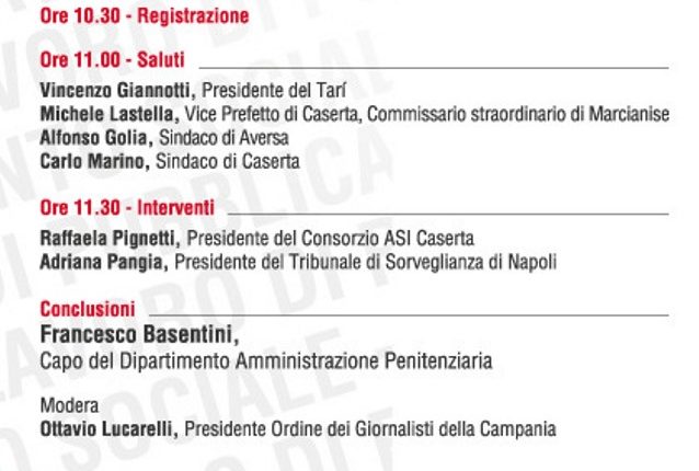 Seguiranno gli interventi del Presidente del Consorzio Asi Caserta, Raffaela Pignetti, del Presidente del Tribunale di Sorveglianza di Napoli, Adriana Pangia e, quindi, le conclusioni del Capo del Dipartimento Amministrazione Penitenziaria, Francesco Basentini.
