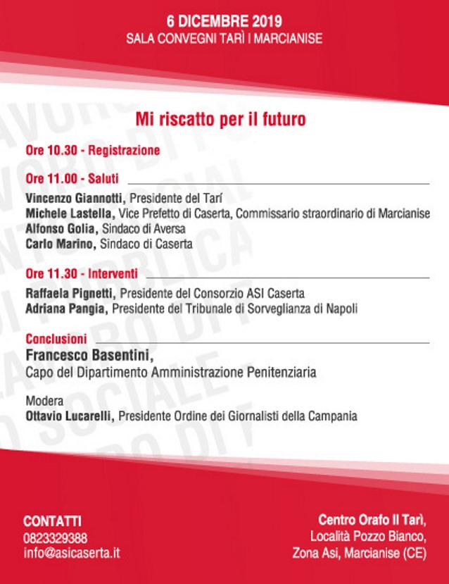MARCIANISE – Venerdì 6 dicembre 2019, con inizio alle ore 10:30, nella sala convegni del Centro Orafo Il Tarì di Marcianise, avrà luogo la cerimonia di sottoscrizione del Protocollo d’Intesa tra Ministero della Giustizia – Dipartimento dell’Amministrazione Penitenziaria- e il Consorzio Asi Caserta.