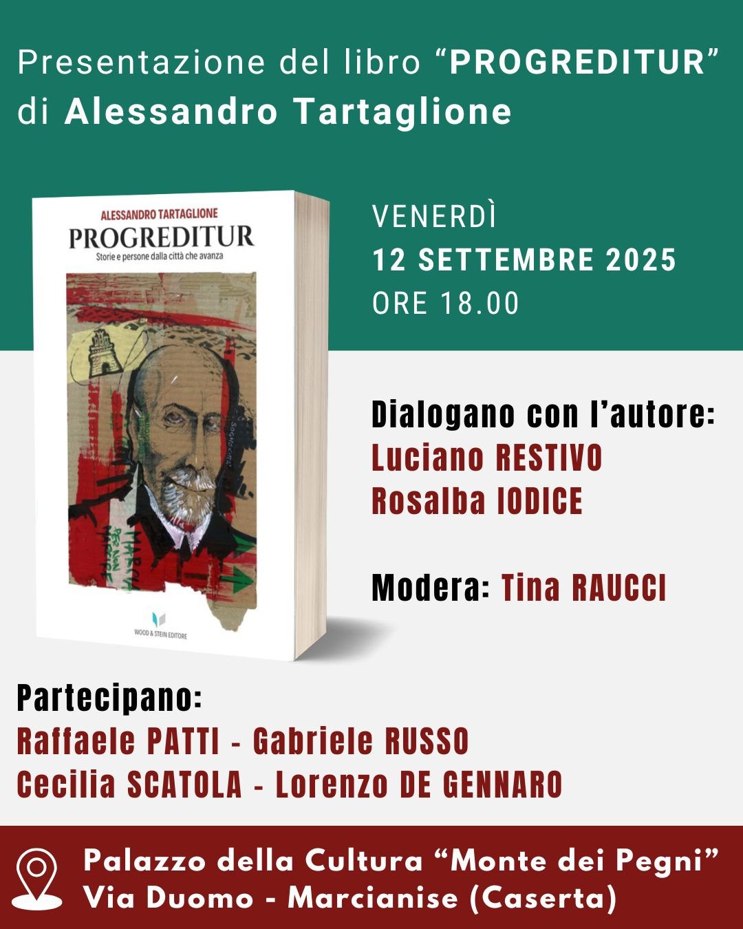 Venerdì 12 settembre 2025, al Palazzo della Cultura “Monte dei Pegni” di Marcianise (Caserta), a partire dalle ore 18.00, si terrà la presentazione del nuovo libro di Alessandro Tartaglione “Progreditur”. Storie e persone dalla città che avanza”.
