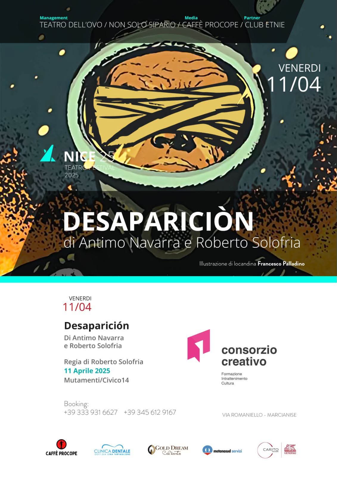 Dopo il grande successo della rappresentazione del “Moro di Venezia-Otello”, il Consorzio Creativo di Marcianise si prepara ad ospitare il sesto appuntamento della rassegna indipendente NICE 25. Venerdì 11 Aprile, alle ore 21.00, nello spazio di via Romaniello n.9, andrà in scena in anteprima regionale “DESAPARICIÒN”. Lo spettacolo, scritto da Antimo Navarra e Roberto Solofria, con la regia dello stesso Solofria, porta sul palco un tema storico e sociale di forte impatto: la tragica vicenda dei desaparecidos durante la dittatura militare argentina (1976-1983). Sul palco si alterneranno gli attori Roberto Solofria, Ilaria Delli Paoli, Antimo Navarra e Michele Brasilio, con i costumi curati da Alina Lombardi. La produzione è firmata da Mutamenti / Teatro Civico 14.