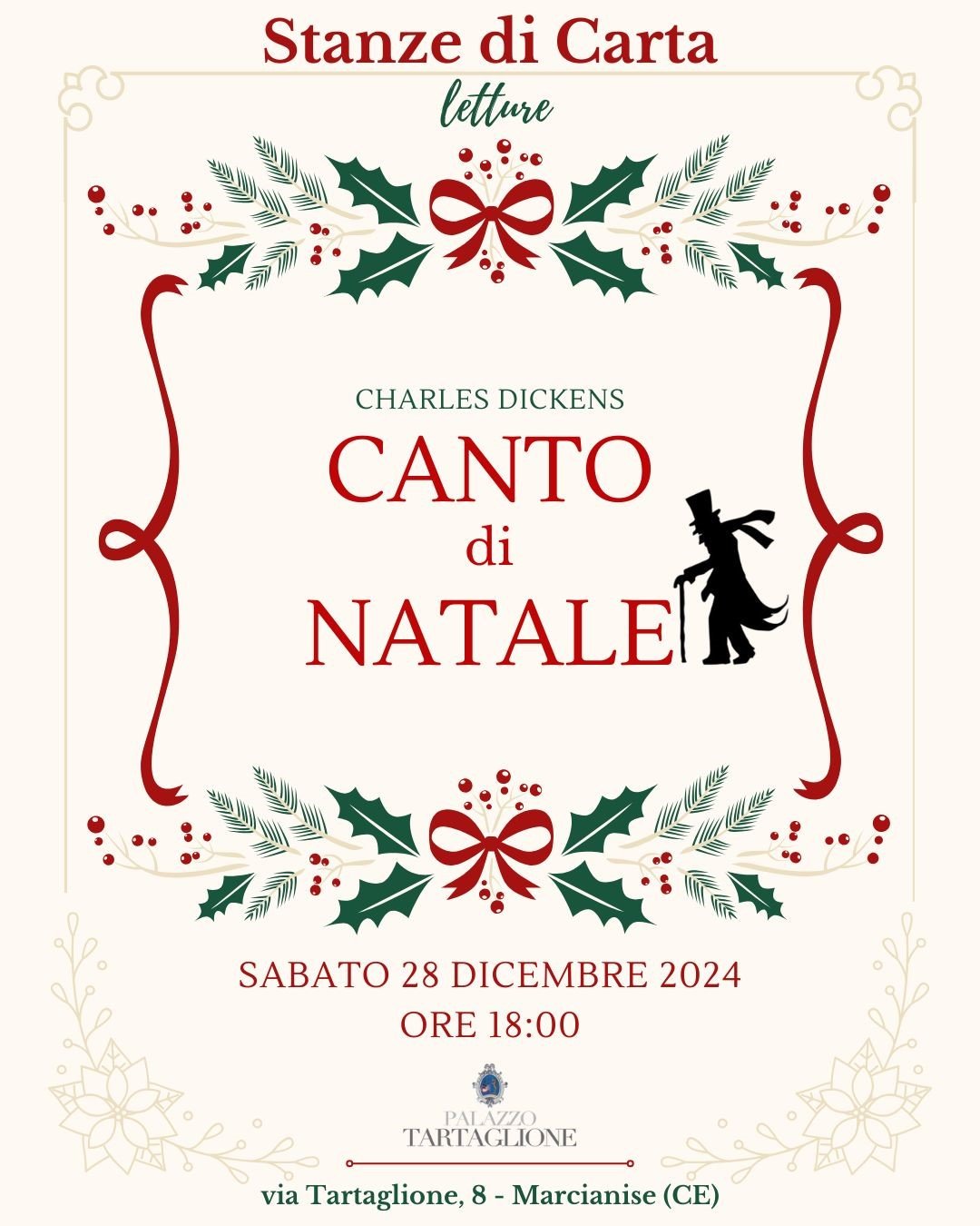 Un nuovo appuntamento culturale al Palazzo Tartaglione si terrà sabato 28 dicembre 2024 alle ore 18.00. Attraverso la lettura del “Canto di Natale” di Charles Dickens, il pubblico sarà accompagnato in un viaggio immaginario e catapultato alla vigilia di Natale nell’Inghilterra del 1843.