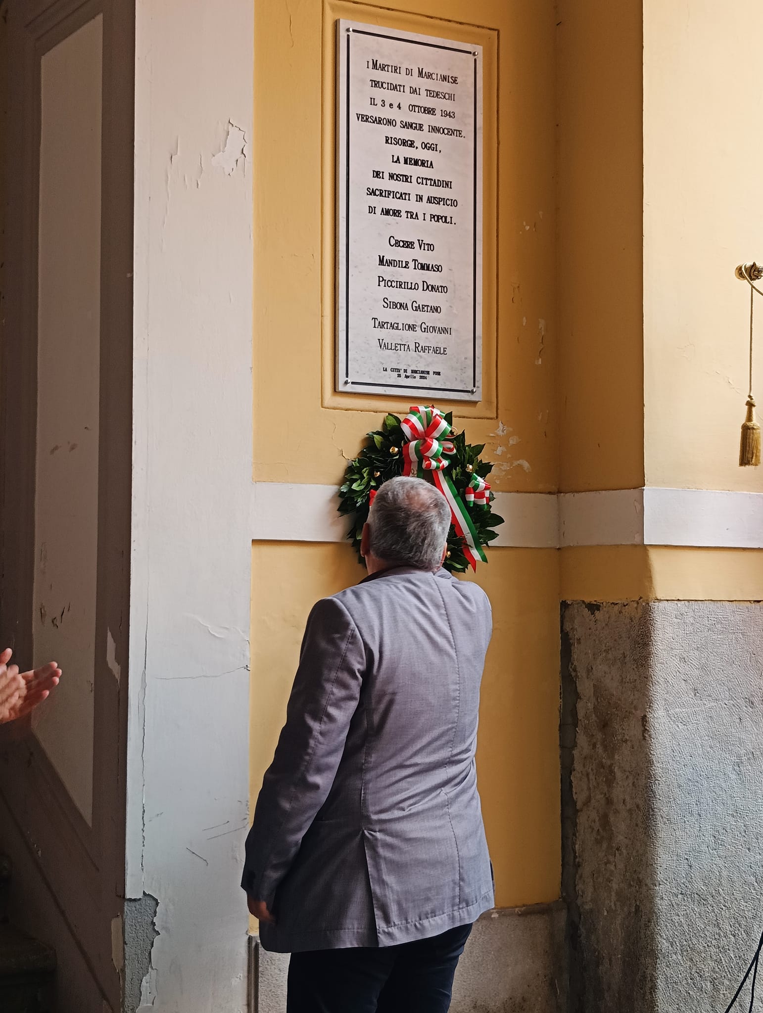 Al termine del suo intervento ha poi deposto una corona di alloro sulla lapide installata lo scorso anno nell’androne del Comune recante i nomi dei cinque cittadini marcianisani rimasti vittima della furia nazista: Vito Cecere, Tommaso Mandile, Donato Piccirillo, Gaetano Sibona e Giovanni Tartaglione.