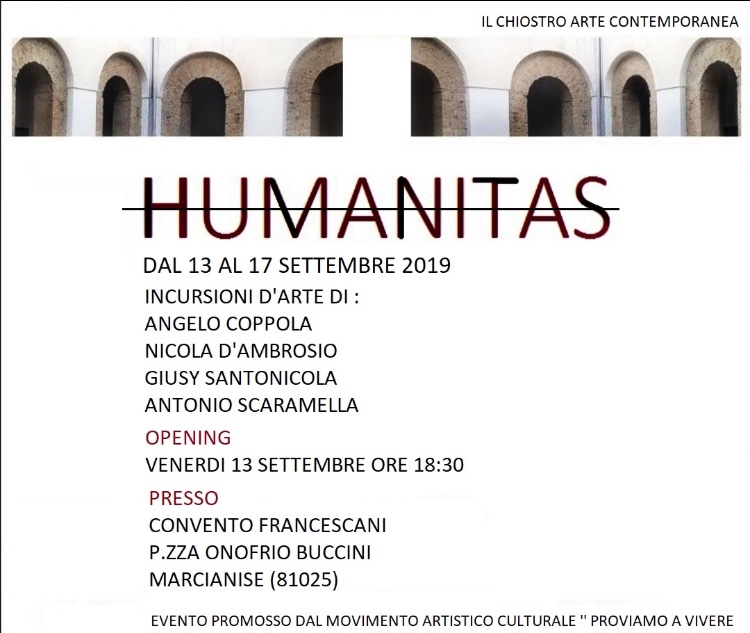Sono completi i preparativi per l’appuntamento di domani 13 settembre 2019 con l’eventoHUMANITAS” che prevede una serie di “Incursioni d’Artedal 13 al 17 settembre 2019 nel Chiostro Arte Contemporanea del Convento dei francescani, di piazza Onofrio Buccini, a Marcianise.