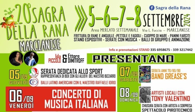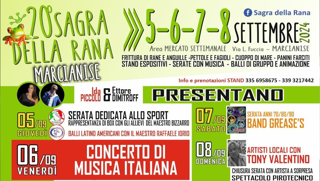 In occasione del ventennale della sagra della rana di Marcianise, l’Associazione il Sito, ha programmato una festa d’eccezione con tanti ospiti musicali, che delizieranno il palato, non solo culinario, dei tanti visitatori. La festa inizierà giovedì 5 settembre con una serata dedicata allo sport della “noble art” del pugilato, si esibiranno gli allievi della storica palestra di boxe del maestro Bizzarro, a seguire il maestro Raffaele Iorio, intratterrà i presenti con una selezione di balli latino americani coinvolgendo la platea. Venerdì 6 il piatto forte, Enzo Avitabile, i Bottari e i Black tarantella si esibiranno in una strabiliante serata tradizionale e fusion, di: jazz; funk; soul e folk, che regaleranno una serata dal ritmo prorompente nel solco della tradizione. Altra grande serata sabato 7 completamente dedicata alla musica che ci ha fatto sognare e ballare negli anni 70, 80 e 90 con, la Band Grase’s. Infine domenica 8 nella serata conclusiva si esibiranno una rappresentanza di artisti locali e a terminare un fantastico spettacolo pirotecnico chiuderà l’edizione della seconda decade di vita di una festa che partita dalla tradizione,  punta al futuro. Basterebbero gli eventi descritti fin ora e professionalmente programmati dal Presidente Paolo Bellopede e del segretario Alessandro Mandarino, insieme ai loro infaticabili collaboratori, per giustificare una visita alla XXa Sagra della Rana di Marcianise, ma chi si recherà in via L. Fuccia a Marcianise, potrà gustare la tradizione culinaria del posto, con una varietà di pietanze uniche nel loro genere e difficili da ritrovare altrove. Apriamo, con la regina della sagra, la frittura di rane, ma anche quella di anguille, proseguendo con le deliziose Pettole e fagioli, le gustose zeppole alle alghe  e l’immancabile panino salsiccia e friarielli, o dalle diverse varianti di gusti di panino possibili che lo chef Carmine Russo saprà creare.  Non solo batraci e anguille ma anche pesce quello dalle paranze, con i cuoppi, le intramontabili patatine fritte la frutta, i dolci e l’amore che questa Associazione mette a disposizione dei visitatori per far rivivere e rivalutare la propria terra.