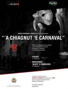 Tradizionali riti pagani, danze dionisiache, suoni tribali e fiaccolate, saranno accompagnati da una performance artistica che vuole celebrare il funerale del Carnevale, con canti, processioni, lamenti e vedove in lutto. Radici, invece, darà vita a “Marcianise Ncopp o’ tammurro”, il grande raduno spontaneo di balli, canti e suoni popolari del basso casertano. Si accenderà un genuino clima di festa con balli e canti sul tamburo, al centro della corte vecchie e giovani mani percuoteranno “castagnette e tammorre” scandendo ritmi forti, decisi, travolgenti che ricordano a tratti arcaiche sonorità guerresche, suono ossessivo sul quale inizia la danza che man mano diventa sfida e resistenza. L’evento ha lo scopo di salvaguardare e tramandare le tradizioni locali, infatti l’iniziativa affonda le sue radici nella più autentica tradizione carnevalesca di Marcianise e dintorni.