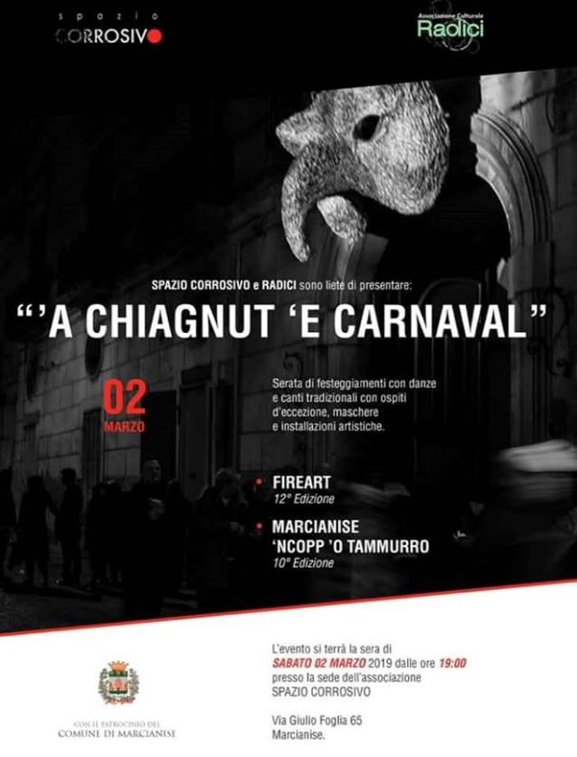 MARCIANISE – Nell’ambito delle manifestazioni del Carnevale a Marcianise, nell’antico Palazzo Grimaldi di via Giulio Foglia, sede dell’associazione “Spazio Corrosivo”, in collaborazione con l’associazione “Radici” si svolgerà “A chiangnut ‘e Carnaval” serata di festeggiamenti con danze e canti tradizionali con ospiti d’eccezione, maschere e installazioni artistiche. Un connubio tra “FireArt – Morte di Carnevale”, giunta alla dodicesima edizione e “Marcianise Ncopp o’ tammurro” che si ripeterà per il decimo anno consecutivo. “FireArt” è un appuntamento culturale dell’associazione Spazio Corrosivo, interpretato in chiave artistica.