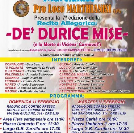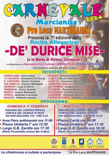 Passate le festività natalizie con l’epifania che se l’è portate via, si fa largo un altro periodo di festeggiamenti, che in verità inizierà con il giovedì grasso dell’8 marzo e culminerà il 13 febbraio prossimo, con il martedì grasso, stiamo ovviamente parlando del carnevale. Anche quest’anno, Pro loco Marthianisi, guidata da Michele Colella organizza in collaborazione con Campania Felix e New Southern Ranch la decima edizione di “Vicienz’ e Carnaval’” e la settima recita allegorica della rappresentazione dei “Durece mise”. Sono previste due rappresentazioni itineranti che toccheranno i luoghi principali della città di Marcianise, precisamente domenica 11 febbraio il gruppo dei recitanti messi insieme da Colella, si esibirà: dalle 11.00 nell’area della fiera settimanale, per poi ripetersi alle 12,30 in piazza Umberto I e alle 17,30 a Puzzaniello nel largo G.B.Zarrillo. Le rappresentazioni si ripeteranno il 13 febbraio alle 16.00 in piazza Carità. Alle 17,30 in piazza Umberto I e di nuovo a Puzzaniello per la chiusura alle 18,30 presso il largo G.B.Zarrillo. In entrambe le giornate i componenti del gruppo itinerante si riuniranno per la partenza, presso il palazzo del Giudice di Pace in via San giuliano 314.