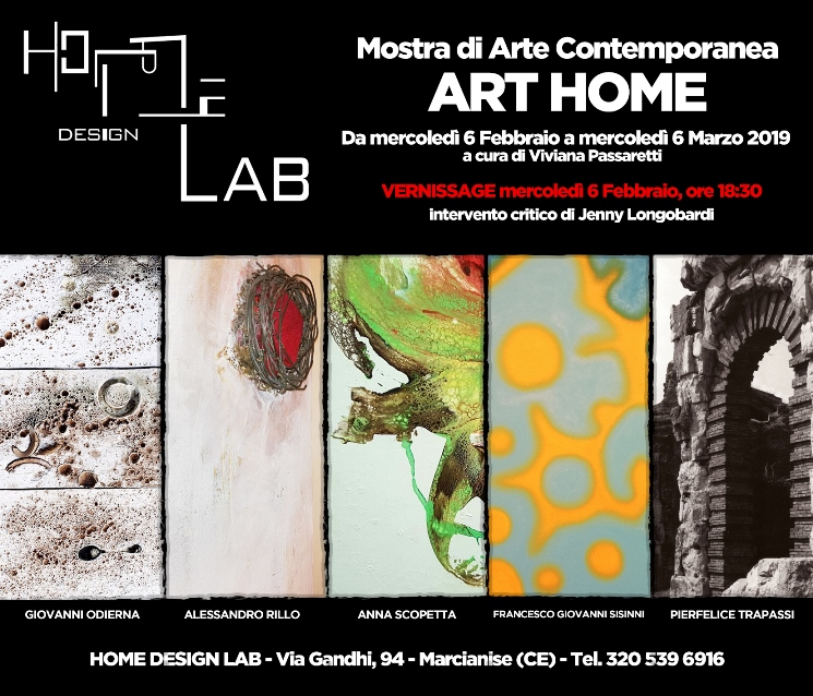 MARCIANISE – Mercoledì 6 Febbraio 2019, alle ore 18,30, sarà inaugurata, presso Home Design Lab, in via Gandhi nr. 94 a Marcianise (CE), la mostra collettiva di arte contemporanea ART HOME. L’evento, a cura di Viviana Passaretti, con intervento critico di Jenny Longobardi, vede protagonisti cinque artisti e, cioè, Giovanni Odierna, Alessandro Rillo, Anna Scopetta, Francesco Giovanni Sisinni e Pierfelice Trapassi che interpreteranno, attraverso la pittura, la scultura, la fotografia e l’ecosostenibilità, l’idea di una casa che si anima grazie al tocco che solo la creatività può conferire. L’arte, infatti, oggi più che mai, sposa il design, esprimendo al massimo la vena contemporanea delle tendenze del mondo dell’arredamento.