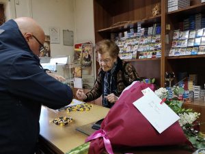 MARCIANISE (Nunzio De Pinto) – Tutto si aspettava la signora Angela Piccolo tranne di essere la protagonista di uno dei servizi giornalisti del telegiornale del TG5 di Mediaset delle ore 8.00 di oggi, domenica 13 gennaio 2019. Ma la notizia era assolutamente doverosa non solo per l’età avanzata della protagonista (90 anni) ma per il suo coraggio, tanto da suscitare l’ammirazione da parte del Sindaco di Marcianise, Antonello Velardi, e della sua Giunta che si sono recati nel suo negozio di Tabaccheria per rendere omaggio al suo coraggio.