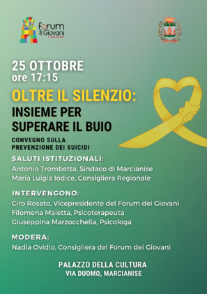 Si terrà presso il Palazzo della Cultura ex Monte dei Pegni, venerdì 25 ottobre, dalle ore 17.15, il convegno promosso dal Forum dei Giovani intitolato ‘’Oltre il silenzio: insieme per superare il buio’’.