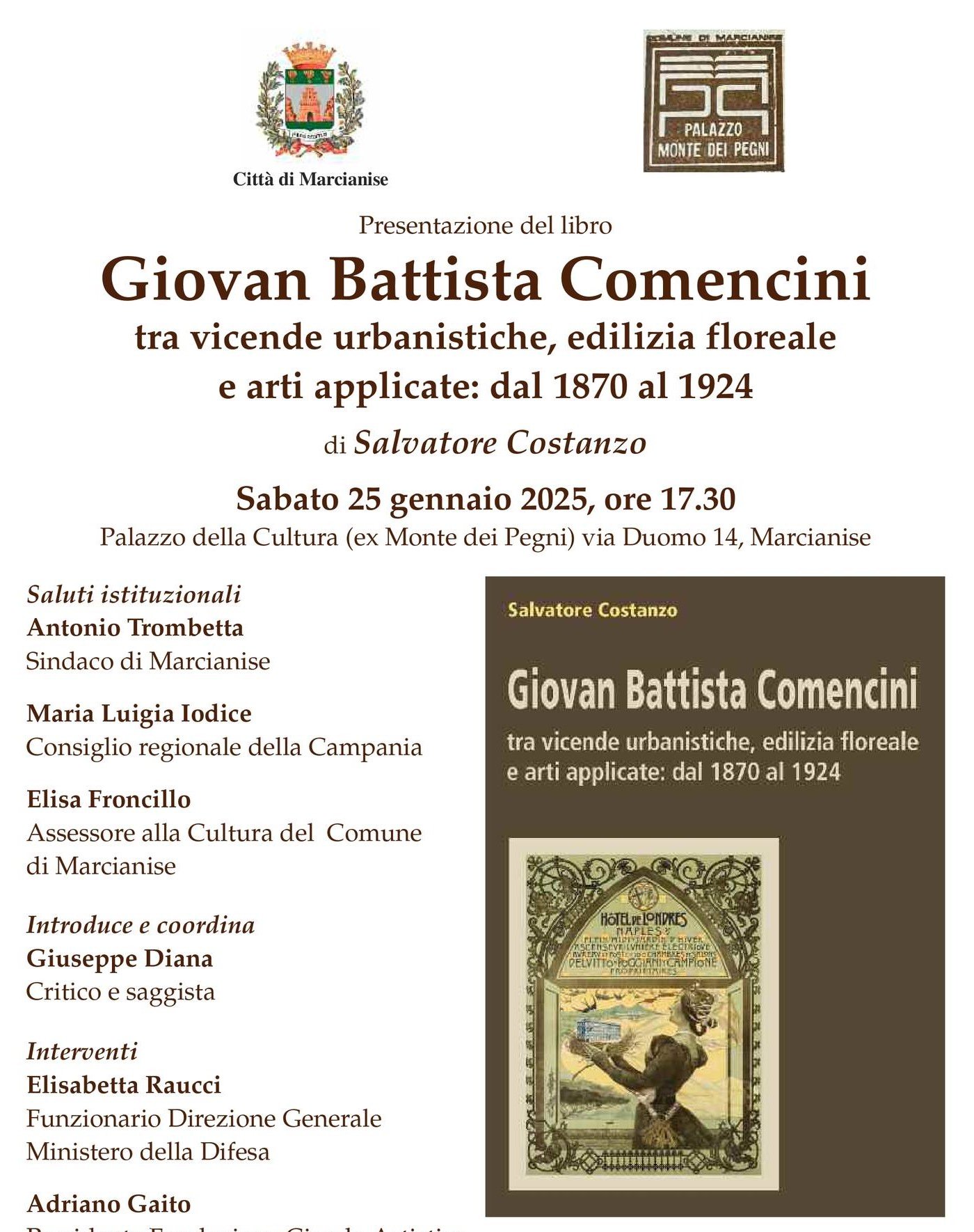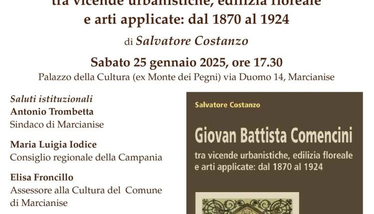 Sabato 25 gennaio alle ore 17,30, nel Palazzo della Cultura di Marcianise, sarà presentato il nuovo libro di Salvatore Costanzo sulla figura e l’opera dell’architetto-ingegnere Giovan Battista Comencini (Udine 1849 – Napoli 1924) che con la sua arte riuscì a introdurre per primo a Napoli le nuove tendenze del gusto liberty.
