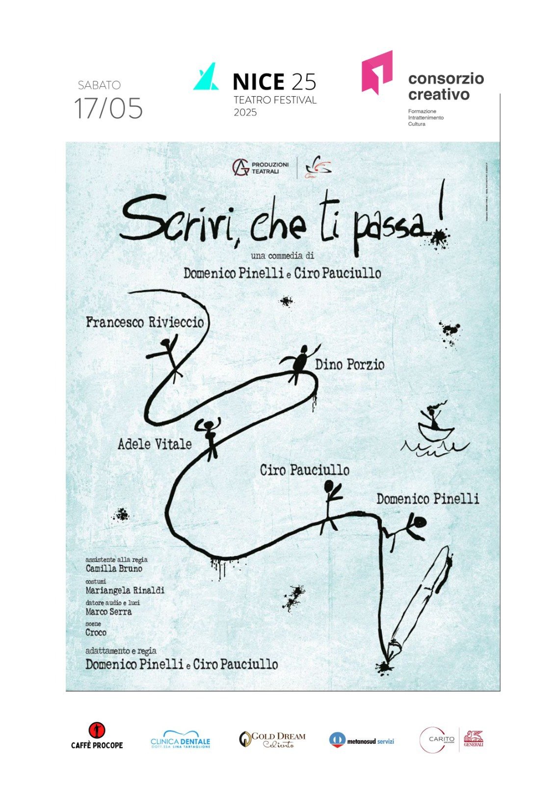 Ritorna il teatro di qualità a Marcianise in via Romaniello 9. Il Consorzio Creativo ospiterà sabato 17 maggio alle ore 20.30 un appuntamento imperdibile con “Scrivi, che ti passa!”, una spumeggiante commedia scritta e diretta da Domenico Pinelli e Ciro Pauciullo. Lo spettacolo, presente nel cartellone NICE 25, la stagione di teatro indipendente, promette una serata all’insegna del divertimento e della leggerezza. Sul palco, un cast di talento che include volti noti del panorama teatrale e cinematografico: Domenico Pinelli (già visto ne “I fratelli De Filippo” e “Il Commissario Ricciardi”), Ciro Pauciullo (della Compagnia Biagio Izzo), Dino Porzio (apprezzato in “Fatman” e “Pesci Piccoli”), Adele Vitale (anch’essa della Compagnia Biagio Izzo) e Francesco Rivieccio (“Non dovevo essere io”, “Sciamissa”).
