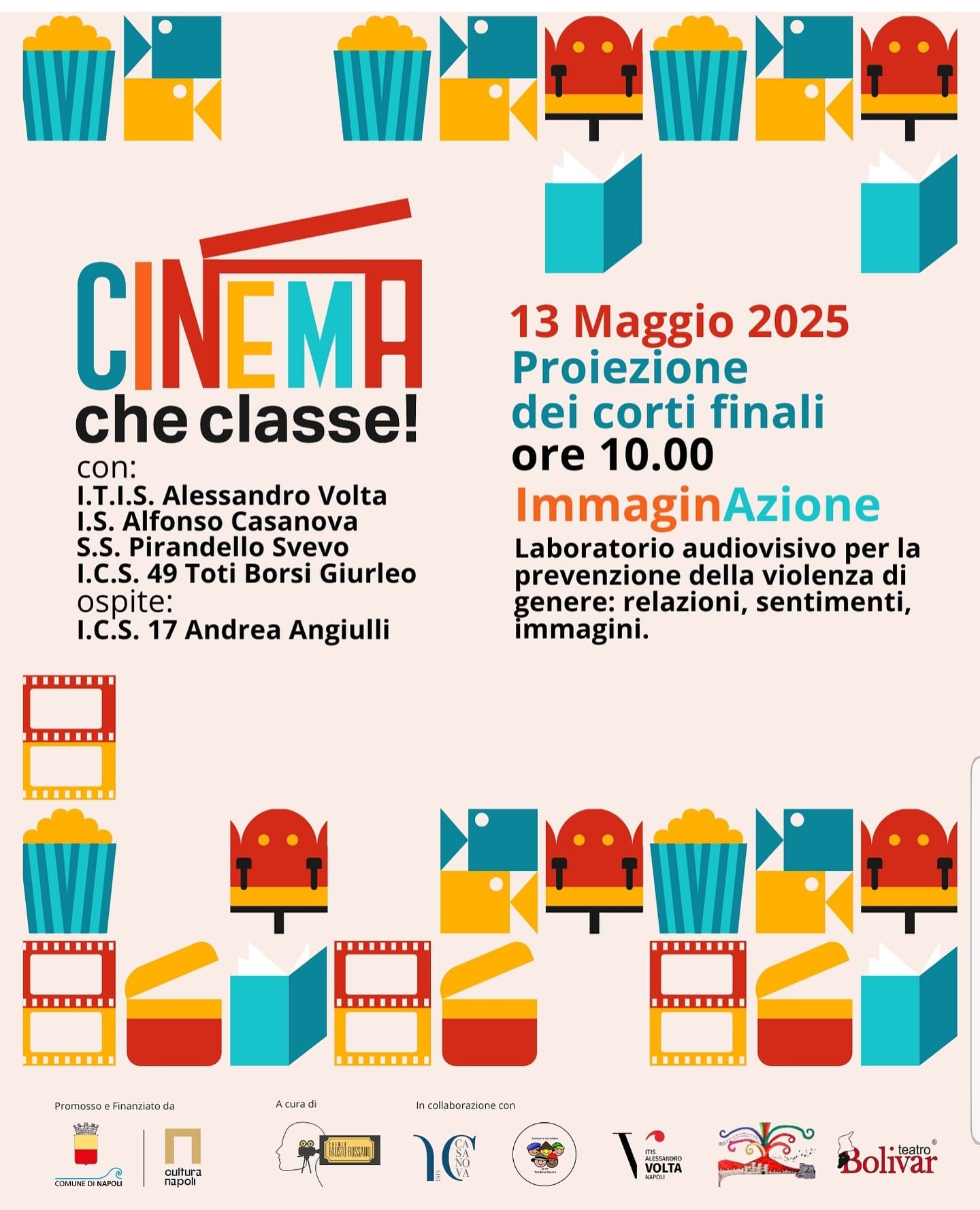 Martedì 13 maggio, alle ore 10.00, al Teatro Bolivar, nell’ambito dell’iniziativa “Cinema che classe! Laboratori di cultura cinematografica per le scuole di Napoli”, si terrà la proiezione dei corti finali di “ImmaginAzione”, laboratorio audiovisivo per la prevenzione della violenza di genere: relazioni, sentimenti, immagini. L’iniziativa, promossa e finanziata dal Comune di Napoli nell’ambito del progetto Cohousing Cinema Napoli e organizzata dall’associazione Premio Fausto Rossano, vedrà protagonisti i cortometraggi realizzati nei laboratori dalle alunne e alunni delle scuole I.T.I.S. Alessandro Volta, I.S. Alfonso Casanova, S.S. Pirandello Svevo, I.C.S. 49 Toti Borsi Giurleo. Sarà ospite anche l’I.C.S. 17 Andrea Angiulli.