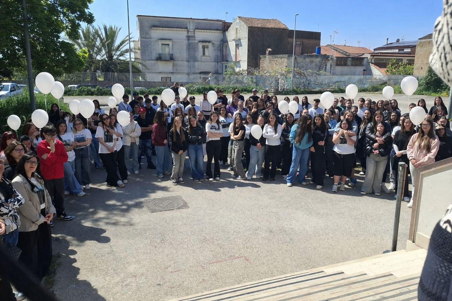 Il volo dei palloncini bianchi nel piazzale dell’edificio scolastico, dopo le parole commoventi della dirigente scolastica Annamaria Lettieri e le altre testimonianze ha sancito un legame tra cielo e terra nel nome di Matteo.