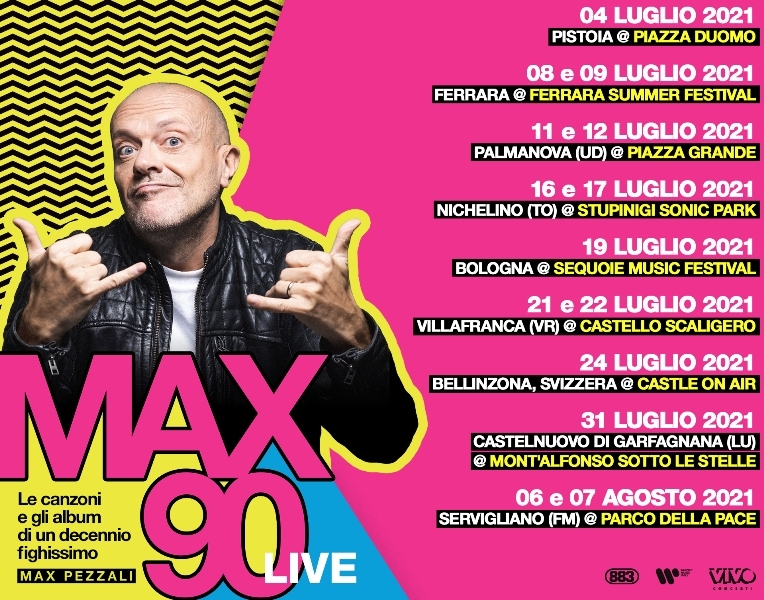 Max Pezzali porta in scena degli spettacoli che avranno come protagonisti assoluti gli anni ’90, con l’impianto scenico e le canzoni che hanno segnato un’epoca raccontata dallo stesso Pezzali nel libro “Max90. La mia storia. I miti e le emozioni di un decennio fighissimo”.