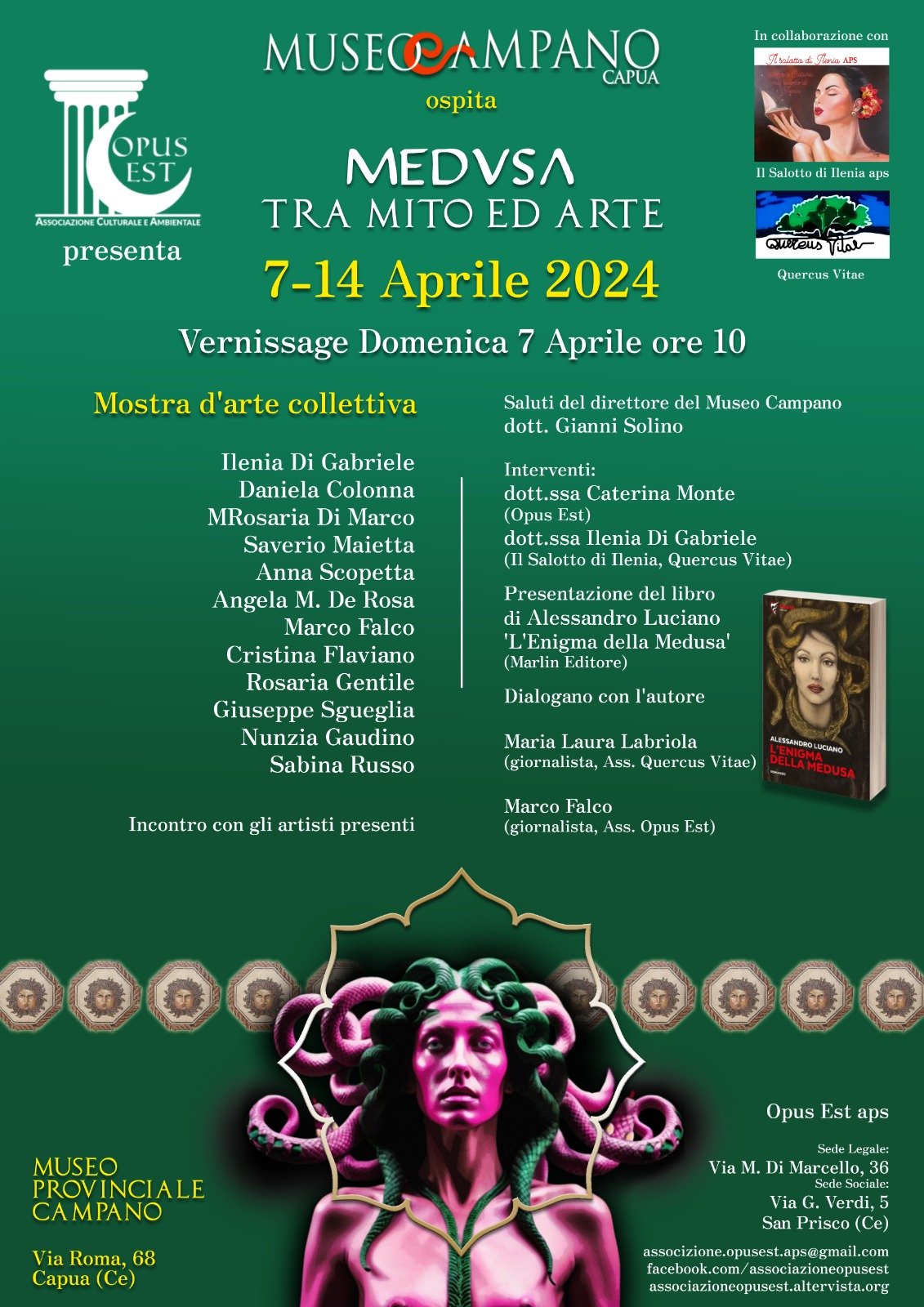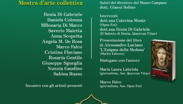 Domenica 7 Aprile si terrà presso il Museo Provinciale Campano di Capua il vernissage della mostra d’arte collettiva dal titolo ‘Medusa – Tra mito ed Arte’, organizzato dall’Associazione Opus Est aps, con la collaborazione de ‘Il Salotto di Ilenia’ aps e Quercus Vitae. Saranno ben 12 gli artisti in esposizione, ognuna con un’opera tematica sul mito della Gorgone con i capelli da serpente e lo sguardo pietrificante, in antichità raffigurata su oggetti, utensili, armamenti e decorazioni in chiave apotropaica o di difesa da spiriti ed essenze malevole. A proporre le proprie opere saranno gli artisti Ilenia Di Gabriele, Daniela Colonna, Saverio Maietta, M.Rosaria Di Marco, Anna Scopetta, Rosaria Gentile, Angela M. De Rosa, Sabina Russo, Marco Falco, Giuseppe Sgueglia, Nunzia Gaudino e Cristina Flaviano. A partire dalle ore 10, poi, si terrà la presentazione dapprima della mostra e delle opere a cura della dott.ssa Caterina Monte (presidente Opus Est) e poi un intervento della presidente de Il Salotto di Ilenia, la dott.ssa Ilenia Di Gabriele. A seguire, invece, si terrà anche la presentazione del libro dal titolo ‘L’Enigma della Medusa’ di Alessandro Luciano, scrittore, ma anche archeologo, dipendente del Museo Archeologico Nazionale e riserva del nucleo tutela beni culturali dei Carabinieri. Si tratta di un noir all’italiana con tanta Napoli e tanta storia a fare da cornice alla storia incentrata sul furto della celebre Tazza Farnese: uno dei reperti più importanti del MANN. A moderare l’incontro i giornalisti Marco Falco (Opus Est) e Maria Laura Labriola (Quercus Vitae). I convenuti e i visitatori potranno interagire con gli artisti presenti. La mostra permarrà nei locali del museo capuano fino a domenica 14 Aprile, quando si terrà il finissage dell’esibizione artistica con un brindisi coi partecipanti all’evento.