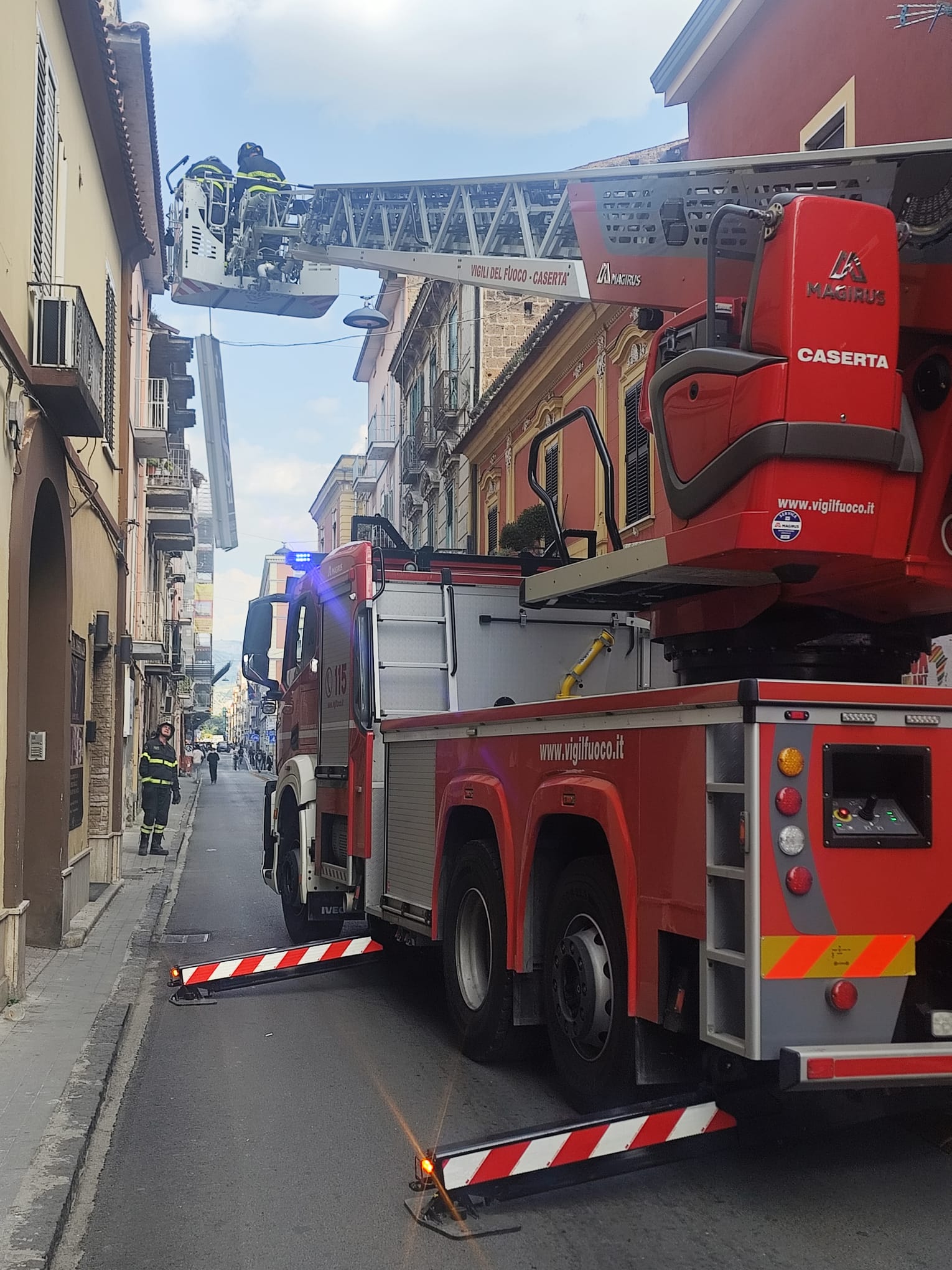 Sul posto la squadra dei Vigili del Fuoco di Caserta, insieme all’Autoscala, si è attivata per la messa in sicurezza e la rimozione dell’insegna pericolante