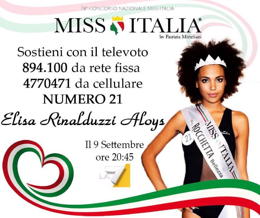 ELISA RINALDUZZI ALOYS ha 19 anni e vive a Carinola (Ce). Di origini africane    (Tanzania/Nigeria), insieme al fratello più grande, è stata adottata a tre anni da due     coniugi campani. Folti e ricci capelli neri, occhi castano scuri, è alta 1.76. Diplomata in   ragioneria, proseguirà gli studi frequentando il corso di moda e designer all’università.