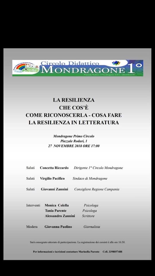Mondragone. Si terra’ martedi’ 27 novembre , a partire dalle ore 17.00, presso il I Circolo Didattico – Istituto Arcobaleno, il Convegno -Dibattito dal tema ” La Resilienza che cos’e’, come riconoscerla – cosa fare . La Resilienza in Letteratura “.