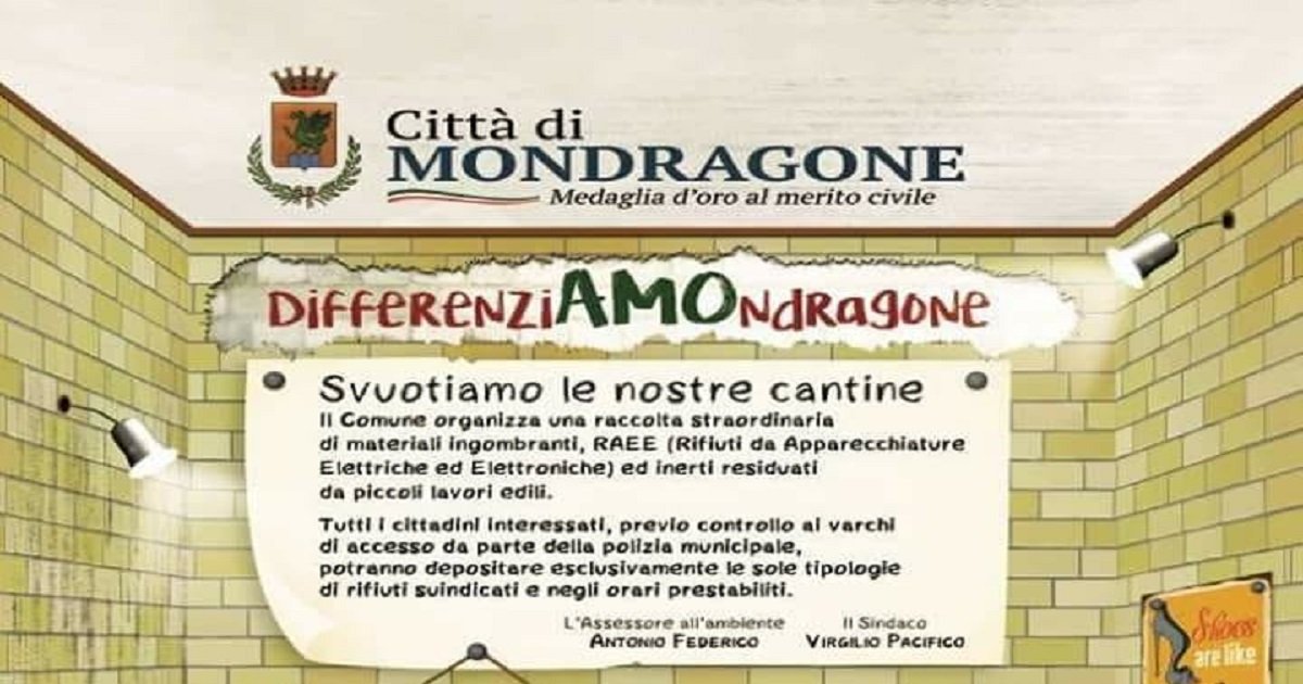 MONDRAGONE – Riparte il progetto “Svuotiamo le nostre cantine” promosso dal Comune di Mondragone e da diverse associazioni locali, sempre in prima linea per affrontare le problematiche mondragonesi.
