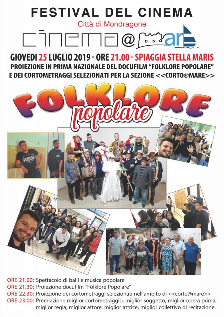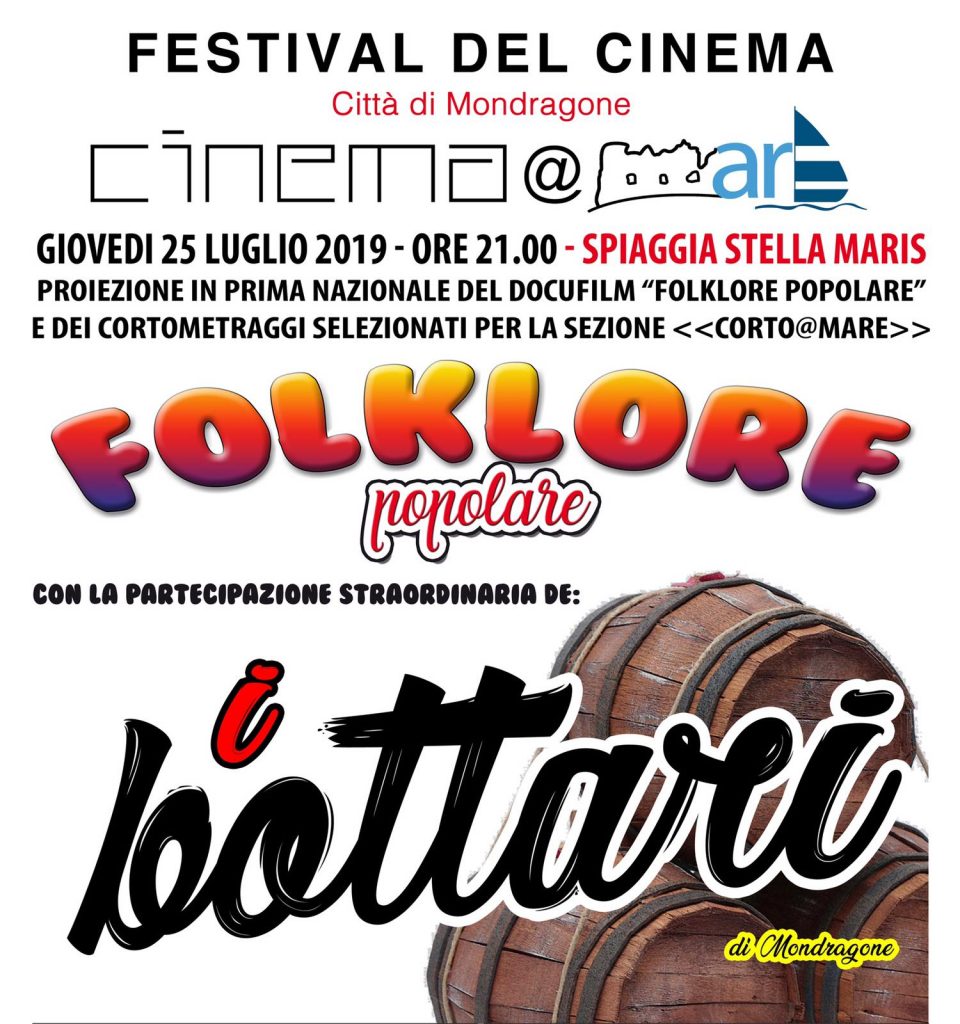 MONDRAGONE – Continuano gli appuntamenti previsti dal calendario del Primo Festival del Cinema “cinema@mare” 2019 – città di Mondragone. Dopo la serata d’inaugurazione, già domani 25 luglio, a partire dalle ore 21 presso la spiaggia libera Stella Maris, ci sarà il concerto de i Bottari che apriranno la serata, seguita dalla proiezione e premiazione dei cortometraggi partecipanti alla sezione “corto@mare” e conclusa con la presentazione in anteprima del docufilm “Folklore popolare” in cui buona parte viene raccontata la riedizione (con grande successo) della Canta dei Mesi.