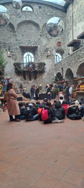 Le caratteristiche architettoniche del Castello di Limatola, infatti, permettono di sentirsi immersi in un luogo fiabesco, che, in questo periodo dell’anno, si trasforma in un posto incantato, pronto ad accogliere grandi e piccini in un percorso magico di luminarie, animato da danze medievali, da artisti di strada, dalla raffigurazione di mestieri medievali, da prelibatezze gastronomiche e dal mercatino di Natale, uno tra i più importanti d’Europa. “Note di Natale” è il tema dell’edizione di quest’anno. Gli alunni della Buonarroti- Vinci sono stati avvolti da un clima energico e frizzante, accompagnati, in sottofondo, da una dolce melodia natalizia. Trasportati da un’atmosfera magica tra elfi, alberi di Natale e presepi, hanno partecipato con entusiasmo alla visita al mercatino, realizzato con casette di legno innevate. Hanno assistito, inoltre, a spettacoli itineranti, e , a tappe prestabilite, hanno visitato la Baita di Babbo Natale, l’Albero dei Desideri, il Museo delle Armature e la Corte Bassa, dove è stato possibile interagire con l’associazione dei medievalisti “FARE ME-DIOEVALE” per una breve formazione didattica sui mestieri antichi. Mimi, ventriloqui e artisti di strada hanno impreziosito il loro percorso e l’organizzazione è stata perfetta ed impeccabile