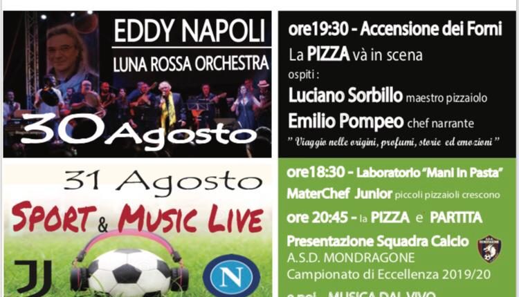 Nella stessa serata avremo il concerto del noto musicista partenopeo Eddy Napoli con l’orchestra Luna Rossa. Il 31 agosto, alle ore 18:30, si svolgerà il Laboratorio “Mani in Pasta”-MasterChef Junior rivolto ai più piccoli, mentre a partire dalle 20:45 gli ospiti potranno gustare la pizza guardando la partita di serie A Juventus-Napoli, che verrà trasmessa in diretta durante la serata.