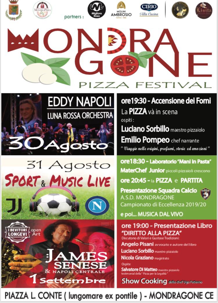 La città di Mondragone si prepara ad ospitare il primo “Pizza Festival”. L’evento, organizzato dall’Associazione “Mondra Pizza” e patrocinato dall’Amministrazione comunale, si terrà in Piazza M. L. Conte dal 30 agosto al 1 settembre, con al centro la genuinità della pizza testimoniata da ospiti d’eccezione come il maestro pizzaiolo Luciano Sorbillo e lo chef narrante Emilio Pompeo, che inaugureranno la manifestazione alle ore 19:30 del 30 agosto, alla presenza del Sindaco Virgilio Pacifico e del Consigliere regionale Giovanni Zannini.