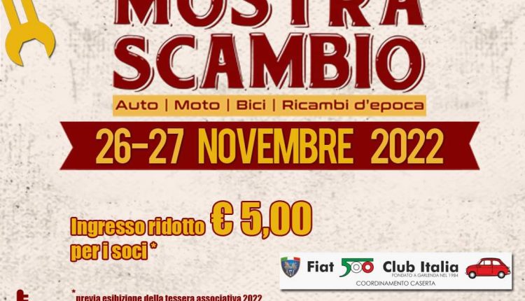 La storia dei motori ritorna a Caserta: IV edizione di Mostra Scambio con l’omaggio alla mitica Fiat 500 Sabato 26 e domenica 27 novembre, al Polo Fieristico A1Expò, il ruggito delle auto d’epoca torna a scaldare i cuori degli appassionati in occasione della IV edizione di Mostra Scambio, la manifestazione dedicata alla motoristica e che contempla la presenza di auto, moto, biciclette, editoria, manualistica, accessori e ricambi, tutto rigorosamente d’epoca.