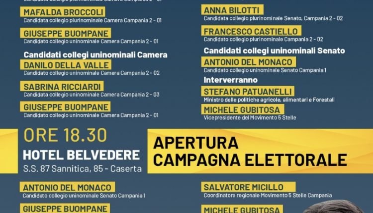 Nel pomeriggio, alle 18:30, ci sarà l’apertura della campagna elettorale all’Hotel Belvedere, sempre a Caserta, con i candidati dei collegi uninominali, insieme al Coordinatore regionale Salvatore Micillo e al vicepresidente Michele Gubitosa. Lo hanno annunciato il Senatore Agostino Santillo e il deputato Antonio Del Monaco.