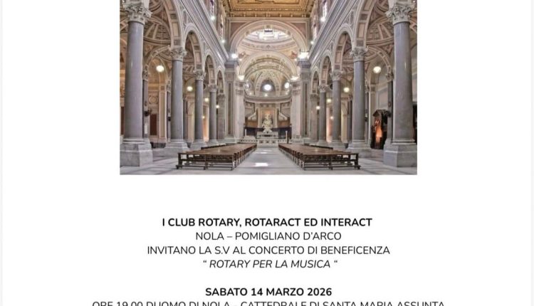 Sabato 14 marzo 2026 alle ore 19:00 nel Duomo di Nola, Cattedrale di Santa Maria Assunta, i Club Rotary, Rotaract ed Interact di Nola-Pomigliano d’Arco si terrà il concerto di beneficenza “Rotary per la musica”. Si esibiranno il coro e l’orchestra “Sanitansamble” con la partecipazione della “Piccola Orchestra di Forcella”. Solista soprano sarà Mimma Iorio, il Direttore Didattico M° Gabriele Bernardo, il Direttore e Concertatore M° Paolo Acunzo e Direttore Esecutivo M° Maurizio Barata. Motto del Rotary di quest’anno è “Uniti per fare del Bene” e sarà il controcanto alle note del concerto.